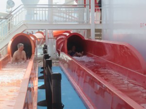 We are now almost half way to the Azores. Today the temperature was going to be 20c so we decided if we were going to have a swim, today would probably be the warmest as we are heading north. It was slightly cool in the pools but needed to make the most of it. Being the big kids that we are, we tried out the water slides. There was a sheer drop one which only Fraser tried. Di decided she didn’t need a colonic lavage this early in the trip.