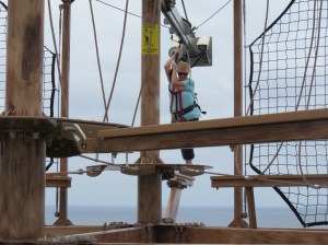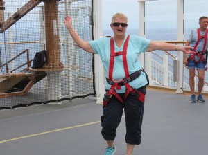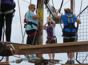 We then did the obstacle course with Sue and by now the wind was picking up and the boat was rocking a little more. They harness you up like 50 shades of grey as they are not into losing passengers overboard. The rope course is on the very top of the boat so as you are walking around the edge and hanging out over the water it becomes a little disconcerting.