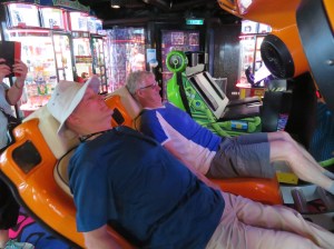 Sue had some credits in the arcade so the four fossils decided to elbow out the scone grabbers and take over. No scone grabbers there so we assume that arcades are “..just soooo yesterday.” We had a hoot though as we found this machine that imitated a roller coaster. You know when you are old by how dizzy you are when you get off something that is stationary.