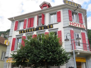 So into Meiringen we rode looking for our bed for the night. Now when choosing our accommodation for Switzerland we gave ourselves a budget of $200CAD per night which should get us three star digs. Last night in Interlaken was great but when we got to Meiringen and we saw Gasthous Ad-er we had a sinking feeling – not sure where the L disappeared to.