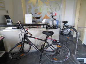 We had informed them via email that we were arriving on “velo’s” of which they decided we must have been joking. Not to many people check into a business hotel on bikes. Anyhow the place is not manned on the weekend (being a business hotel) so when we arrived we only found the cleaner. She wanted us to put the bikes outside in the parking lot of which we declined. So we think we have lowered the standard of the hotel for tonight with two bikes parked at the front reception desk. It was where she wanted us to put them in the end.