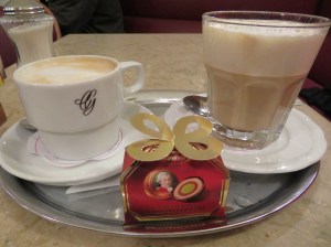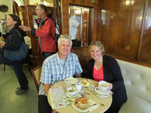We got tired of dodging the rain so popped in for one more cuppa and a Mozart chocolate – they were prolifically selling them so thought they must be good so just had to try one. Both agreed it was a bit so-so. Sucked in by marketing again!!!