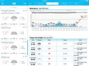Enough heavy stuff. Below is a screen capture for the weather that we are expecting tomorrow for our trip up to St Wolfgangsee which is in the lakes district near Salzburg. They have red weather alerts out tomorrow for areas of southern Germany and Austria which is exactly where we are – oh, aren’t we just so lucky!!!!