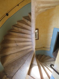 The stairwell to the bedrooms is in the turret. It is a quintessential French farmhouse arrangement where the kitchen is large and down stairs. Belinda is not sure just how many bedrooms there are. There are actually two families that live in the house. – generational type of thing.