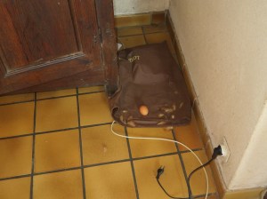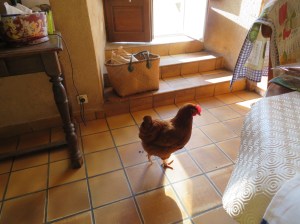 Whilst having breakfast prior to leaving the chateau, the chook decided she would pop into the kitchen for her morning ritual of laying her egg. They had two chooks turn up out of the blue about two months ago who have adopted the chateau as their new home. One of them is very secretive and they are unable to locate her eggs but the other one is frightfully open about it.