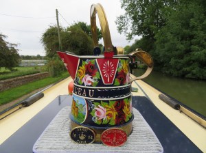 There was a great wooden duck with boots painted in the colours of a British Flag but it was a little too big for us to transport back. Instead, for this canal trip we have purchased two canal plaques. We purchased quite a number of these last year as we completed the different rings or canals. Not too sure what we will do with them all yet. At the bottom of the Ange De L’Eau can, you can just make out the Ashby Canal and Warwickshire Ring plaques.