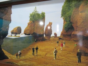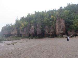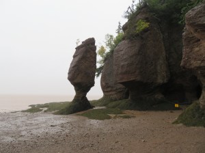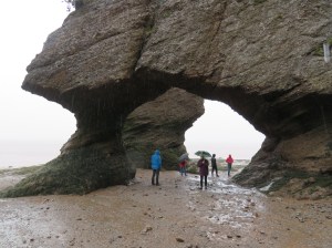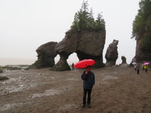 It was a quick ten minute car ride to the Hopewell Rocks from our not so salubrious hotel last night. We dragged out the rain jackets and the brollies and headed off for the fifteen minutes walk and 108 (we counted them) steps down to stand on the ocean floor. The low tide was at 9.00am and they wanted you outta there at 12.30pm otherwise you were going to drown – to put a fine point on it.