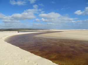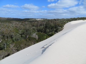 Rising up to 40m above otherwise normal forest. They form a ten kilometre long body of sand being blown inland, swallowing the forest at a rate of about 4 metres each year. Slow, but unstoppable.