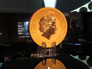 In October 2011, the Perth Mint created the world’s largest, heaviest and most valuable gold coin, breaking the record previously held by the Royal Canadian Mint – oops. The coin is approximately 80 centimetres (31 in) in diameter and 12 centimetres (4.7 in) thick, and made of 1,012 kilograms (2,231 lb) of 99.99% pure gold.