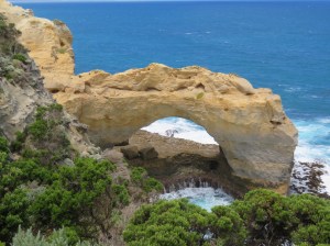 London Bridge is an offshore natural arch formation in the Port Campbell National Park, Australia. The arch is a significant tourist attraction along the Great Ocean Road near Port Campbell in Victoria. This stack was formed by a gradual process of erosion, and until 1990 formed a complete double-span natural bridge.