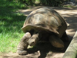 They have two extremely large turtles in an enclosure and they wanted to pass one another with a tree one side and a large rock and limited room. It was most entertaining as it turned into a shoving match with their of them wanting to give way to the other. These guys can live up to 200 years old.