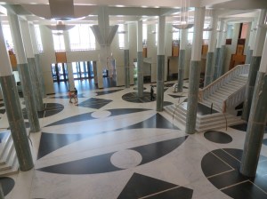 Finally, this is the main entrance lobby into Paliament House. The Marble Foyer features 48 marble columns that evoke the muted pinks and greens of the Australian landscape as well as the colours of the two Parliamentary Chambers. The limestone on the floor is full of fossils of sea life that existed some 345 million years ago. You can see the remains of ancient corals, sponges and crinoids, or ‘sea lilies’. They even pointed out to us “Shawn the Prawn” in one of the pieces of limestone – they just had to Australianise it.