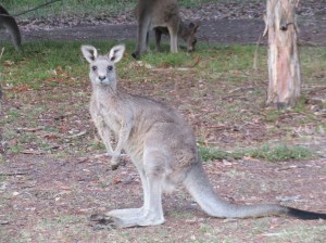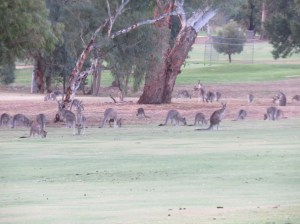 We were not on our own very long before the guys arrived home and our evening started. Near sunset we did go for a walk out their back gate and right onto the golf course. Every night and early morning these guys cluster around to feed. They don’t eat the fairways or the putting greens but the longer grass along the sides. We reckon there must be over a hundred that accumulate here twice a day. We saw a few joeys and even one with legs sticking out from the pouche. Sometimes you will see a large joey crawl inside and you just wonder how something that big can fit in such a small space. There were also lots of different species of birds flying around and squawking and generally making their presence felt. It was a very quintessential Australian fauna scene.