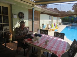 She had a pretty heavy business call and took it at her sons desk and we thought it made for a pretty apt photo. We mucked around the house until 3.00pm and then drove down Frankston which is along the Mornington Peninsula to go and say a final farewell to Di’s neice Anna and her husband Richard and two children Taylor and Hunter.