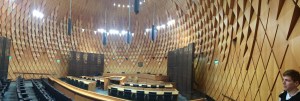 Last port of call today was the New Zealand Supreme Court. We had been told by our friends Carol and Pete who we went camping with in Hawks Nest about this building that they had just happened to wander into. The inside is meant to be the inside of a Kauri pine cone. Kauri forests are among the most ancient in the world. The antecedents of the kauri appeared during the Jurassic period (between 190 and 135 million years ago). The room is not in Kauri as it is protected and we think it was in a pine of some sort. The young security officer told us there were no tours left for the day but he still let us inside the court room to look around. He didn’t know what the wood was but we are pleased we took up Carol and Pete’s suggestion at it was indeed beautiful.