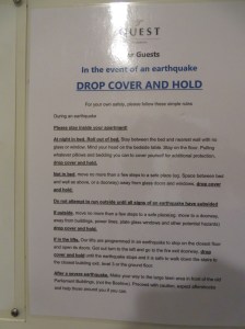 You always know you are in New Zealand when you see the Earthquake Evacuation Warning on the back of the door next to the Fire Evacuation instructions. There is a good reason New Zealand is called the Shaky Isles!!! Just let us get through these next few days without experiencing one, please.