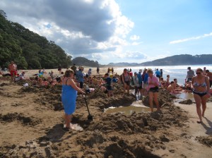 After our half hour slog back up the hill we drove to Hot Water Beach which is a rather interesting geological phenomenon. There is a hot spring region on the tidal area on this beach that if you dig just six inches down, a hot spring will appear…and…we mean hot – burning hot. You take your spade down to the beach or hire one for $12 (thanks for the spade Dex) and start digging a hole just as this myriad of people were doing. Invariably you hit a hot spot, so you make a large enough pool to sit in and then wait for the tide to come up and mix with your hot pool water. You need to watch for hot spots or you will burn you bum.