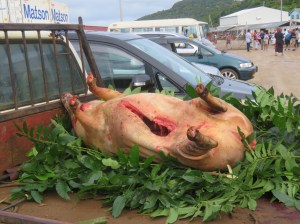 We were met by another work associate from Di’s cousin in NZ called Milla. She was a lovely lady and spent four hours with us taking us around the island. This pig that was all butchered with buzzing blow flies around it was off to Nuku’alofa for the Royal Family. Tongans are large people to begin with but their diet is causing huge problems with obesity and diabetes.