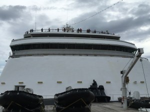 This was our reward which was fabulous. We managed to find our way onto the very front of the ship which is usually secured. We think maybe they opened it up specially for this arrival but very few people took up the opportunity to make it down.