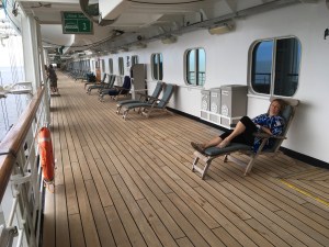 This is Deck 6 which is also the Promenade deck. Four times around equals one mile and at times is a very busy place. It tends to also be where they have the life boats and the tender boats.