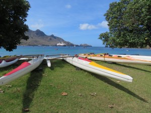 Nuku Hiva does not have an atoll around it so therefore there is no lagoon with that beautiful shallow coloured water which is just beckoning you to swim in. The island appeared very brown but we think we are on the rain shadow side of the island. They are very keen outrigger canoeists and they hang around the bays waiting for boats to leave and then surf on their wakes.