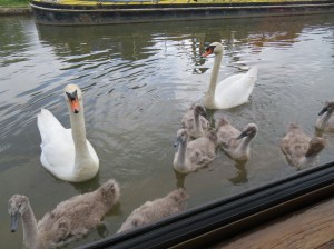 Just before we headed off for the day, Di took Toque off the boat for a toilet break and one of the adult swans got out of the canal and threatened them so much that they could not get back on the boat. They walked down the towpath until they came to a bridge underpass where they got back on. Underpasses are usually narrow and therefore it is easier to step back on a moving boat.