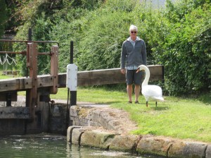 Our first lock presented us with a bit of a Swan problem. Right in front of the closed lock gates was an adult swan with six cygnets. Mean while, at the actual lock winding mechanism stood another adult swan showing some very aggressive behaviour.