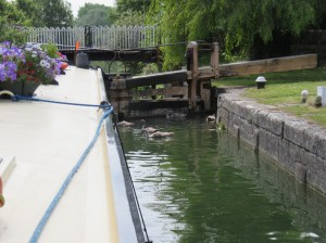 It took us a little while to work out but these guys do it this way so they do not have to walk along the path and negotiate a busy road. Once the bottom gates were open they very happily meandered out onto the lower canal. We were worried we might squash them in the lock but the adult swans kept them well out of harms way. Whether they would try this with two boats in the lock would be interesting to see.