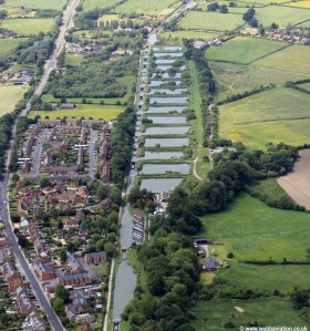 Aerial photograph of Caen Hill Lock Flight in Devizes arguably the longest flight of 16 locks – if not the most impressive anywhere on the UK’s waterways. The locks and ponds were the last stretch of the Kennet & Avon Canal to be built in 1810 and form part of a longer 29-lock flight at Devizes, all packed into just over two miles. They are designated as a Scheduled Ancient Monument – the same level of heritage protection given to Stonehenge.