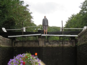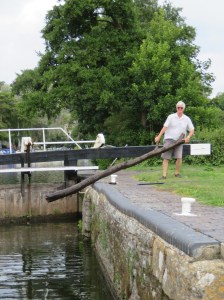 We continued to have very large locks to deal with during the day and this particular one had a huge log floating just in front of the boat. To save disappointment Fras decided it would be better for him to remove it from the lock as it could do significant damage to the lock gates or the boat. By now it was raining fairly hard but with two umbrellas to stayed relatively dry. It was more important to keep Toque dry as there is nothing worse than a wet dog in a confined space such as a narrow boat!!