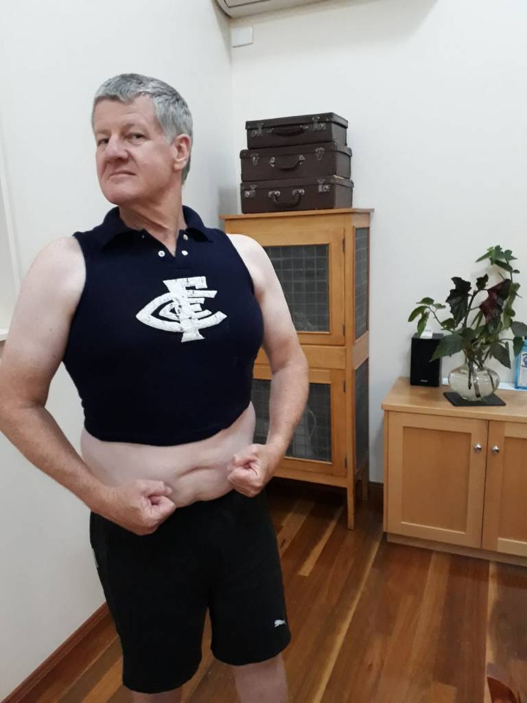 Fraser’s brother David, decided it was time to dust off his old Carlton jersey that his mum had bought him when he was a little tacker. The picture shows it all!!!! Please don’t look too closely as you may do severe damage to your eyesight.
