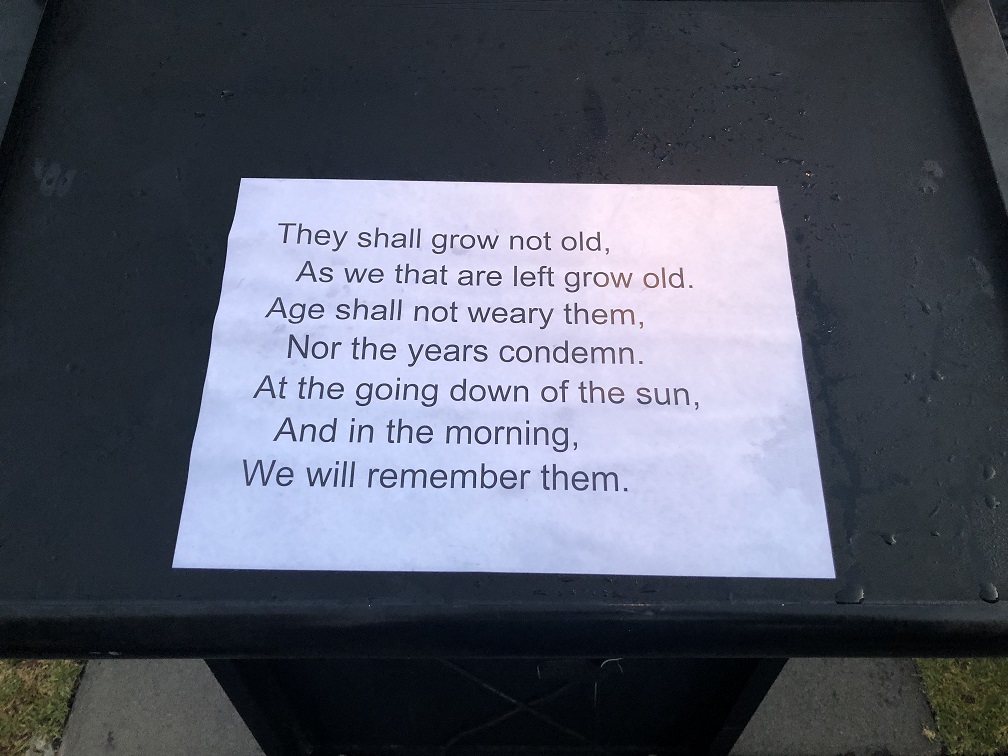 We found the Ode to the Fallen, taped to the lectern and read out at the ceremony. Fitting for us in that the author of those words was John McCrae, the Canadian – we wonder how many Aussies and Kiwis are aware of that.
