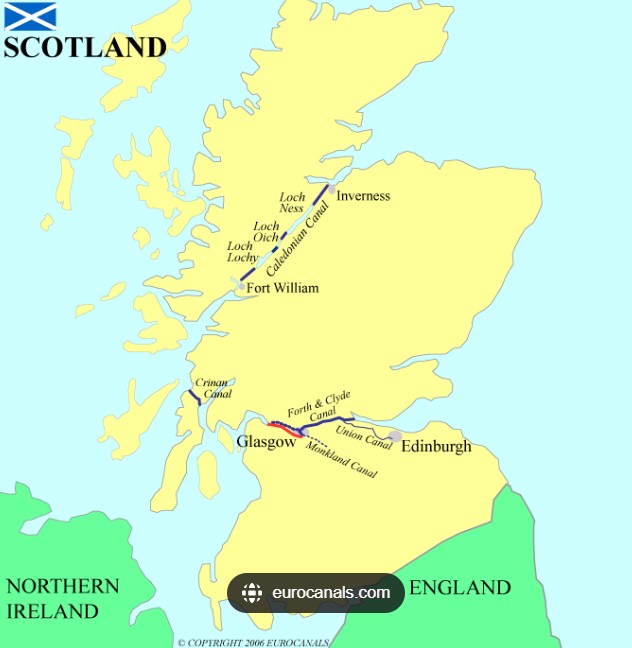 The map above shows the not so extensive canal system in Scotland. The southerly canal is the Forth and Clyde Canal and the Union Canal which are the ones we are attempting.