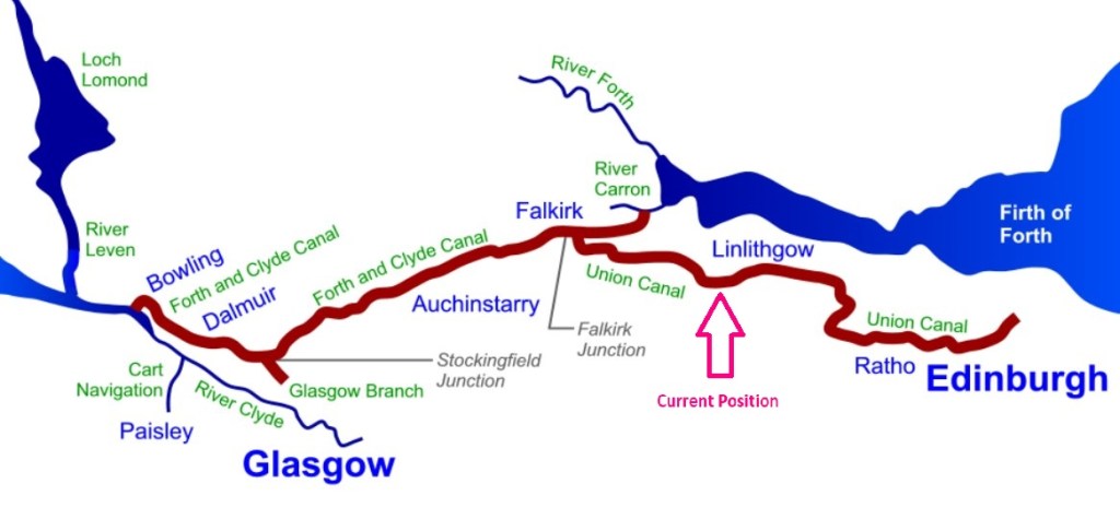 Plans today were to get a little beyond the village of Linlithgow. We have found the going very slow as the canal is narrow and shallow so we couldn’t get a decent speed up to meet our target comfortably. We anticipated on doing the trip to Edinburgh in two days but it is going to take two solid days of cruising to get there. About seven hours per day which is a lot. One of the joys of canal boating is to take it slow and take in the scenery, rather than turn it into a slog.