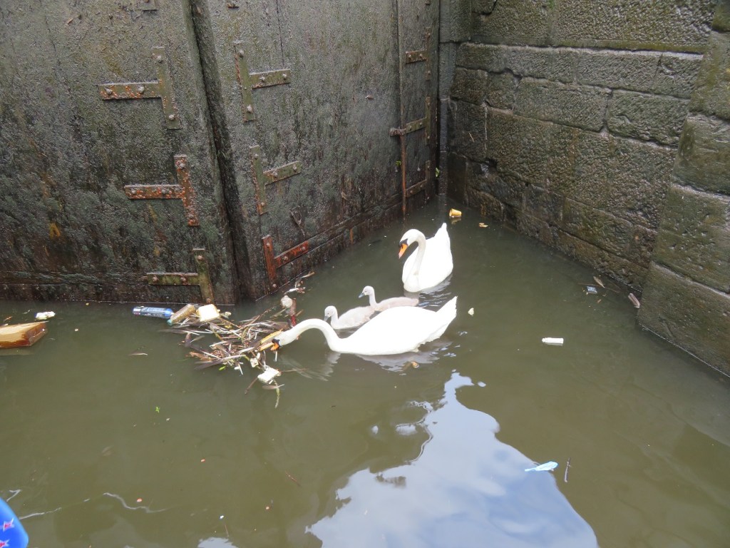 Meantime, at the next lock, mum and dad swan with their two offspring decided to get themselves caught in the lock with us even though we had had serious discussions with them that it was not a smart move on their behalf. All went well though and they exited once the doors were open.