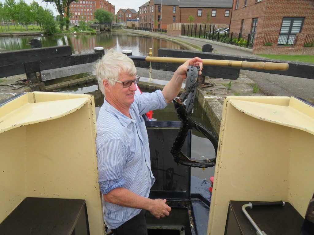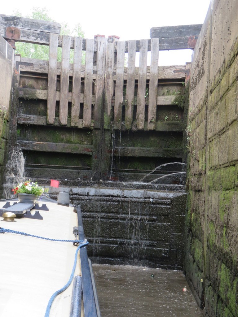 Fraser walked up the next four locks which were all close together thankfully and opened up the paddles on the gates to let water down to the pound where the boat was beached. It took about 30 minutes before the boat refloated and we crawled into lock 77. The picture doesn’t really show it, but we were very much near the bottom of the lock.