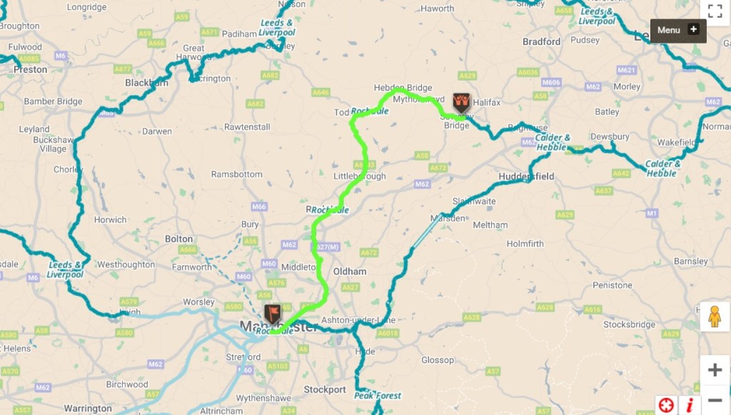 So, the bright green shows the Rochdale Canal starting in Manchester at lock 92. Yesterday we did the first nine locks. We had a very secure mooring last night and got up at the ungodly hour of 6.00am to be on the go by 6.45am as we had 20 locks to do.