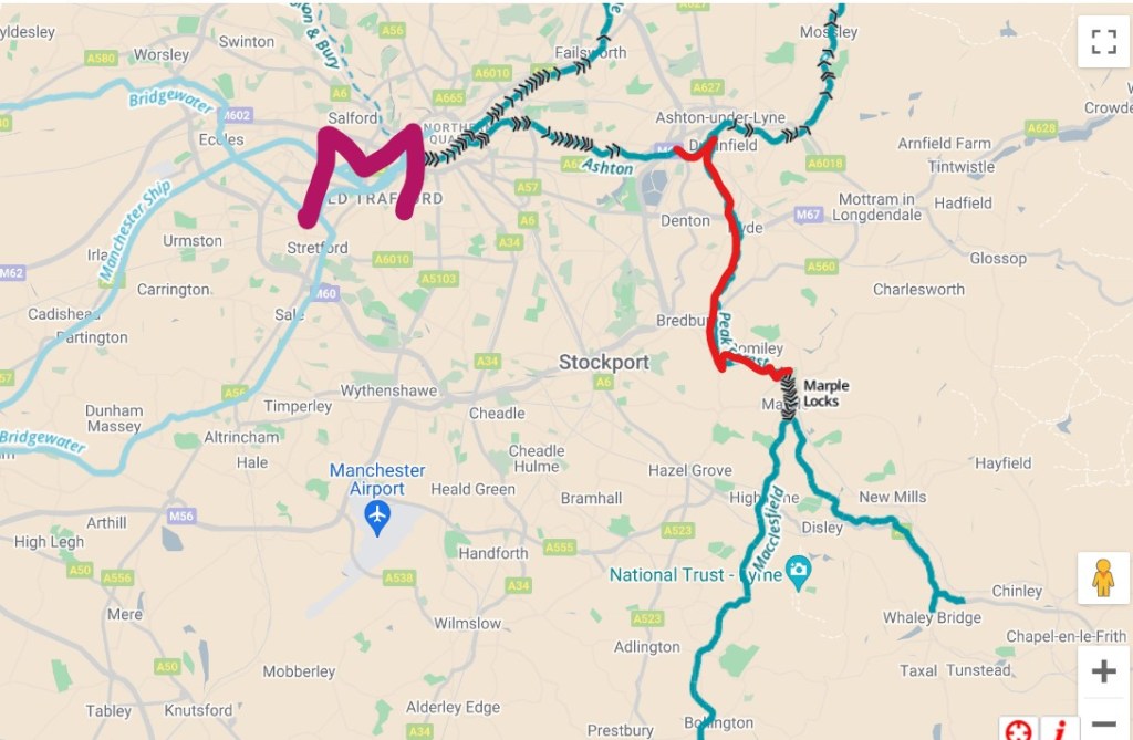 The purple M is where Manchester is, and the red line shows you our progress today. We are moored just below the Marple flight of 16 locks. Due to the water restrictions, they are only allowing boats up and down the Marple flight on Tuesdays and Saturdays between the hours of 8.30am to 12.30pm. It is done under the strict control of the Canal and River Trust who must let out water from the reservoir so we can float our boat.