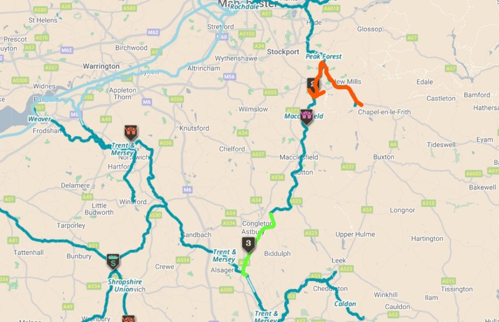 We dropped into the local Tesco at Whaley Bridge to stock up a few necessaries and then headed back along the Peak Forest Canal towards Marple. We then took a sharp left and headed south onto the Macclesfield Canal.