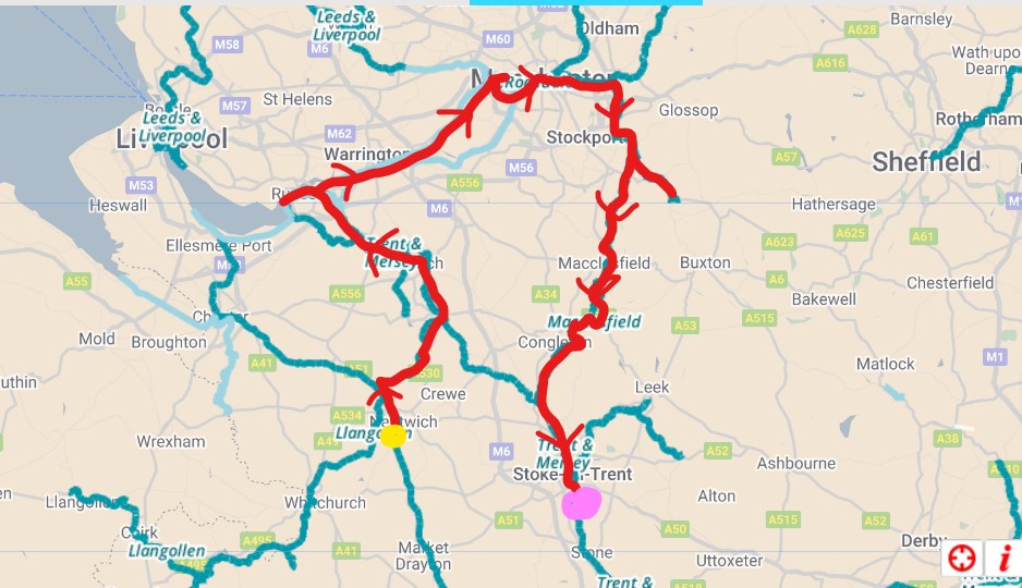 Since we left the Over Water Marina (yellow dot) on the 6th June, we have travelled for 20 days (pink dot). This is a distance of 130 miles (209k’s). We have done 81 locks.