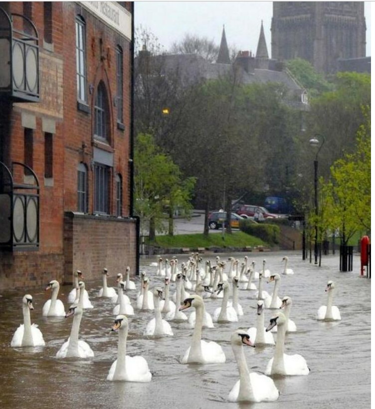 Found this fun shot of the swans in Worcester paddling down the street when the river has been in flood.
