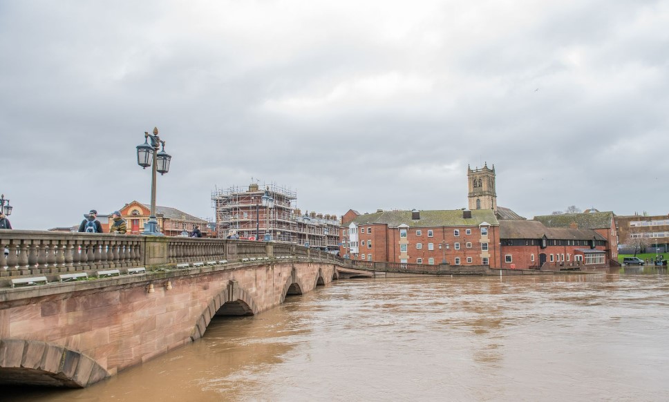 The River Severn (at 220 miles (354 km) long, is the longest river in Great Britain. It is also the river with the most voluminous flow of water by far in all of England and Wales, with an average flow rate of 107 m3/s (3,800 cu ft/s). It rises in the Cambrian Mountains in mid Wales, at an altitude of 2,001 feet (610 m), on the Plynlimon massif, which lies close to the Ceredigion/Powys border near Llanidloes. The river then flows through ShropshireWorcestershire and Gloucestershire. The county towns of ShrewsburyGloucester and the City of Worcester lie on its course.