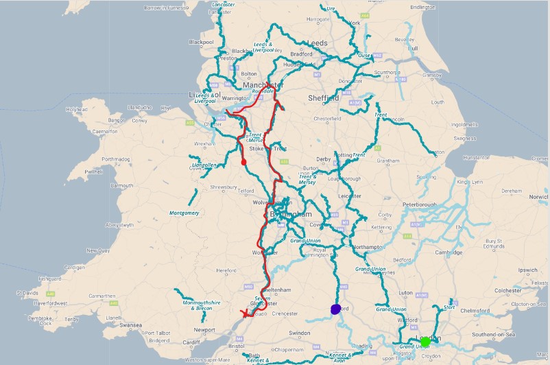 Thought it a good time to give you an overall plan as to where we have been to date. So we started up near Manchester and following the red line it will take you to Sharpness where the red cross is. To help with your geography, we have marked Oxford with a blue and London with a green dot.