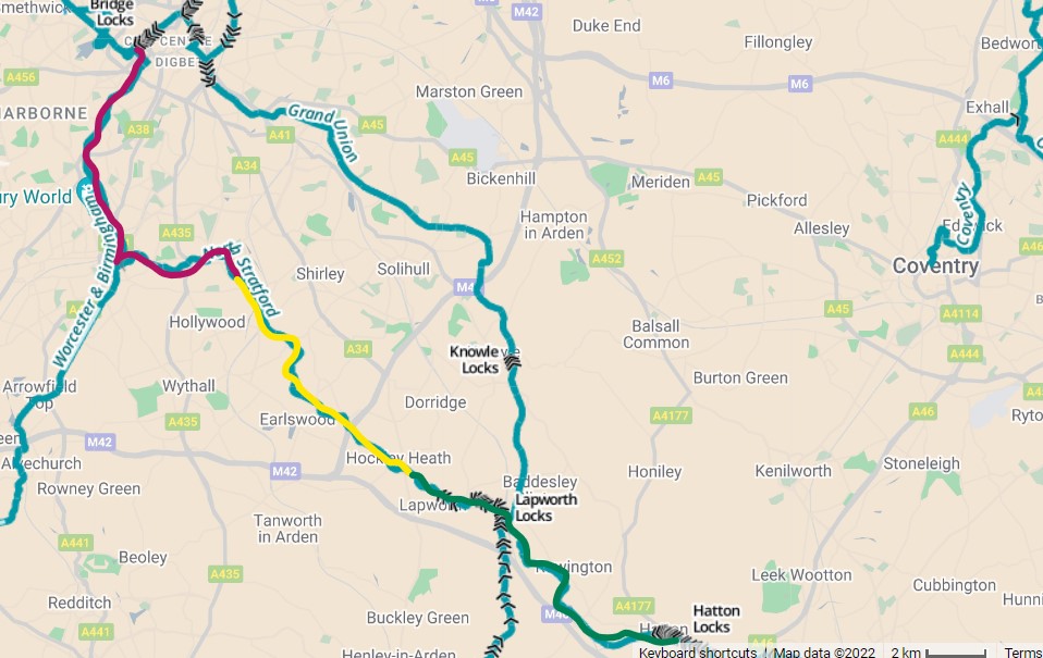 Purple line is where we got today from leaving Birmingham follwed by the yellow line tomorrow to Hockley Heath and then on Friday we will be doing 19 of the 24 Lapworth Locks before crossing onto the Grand Union Canal at Kingswood Junction.