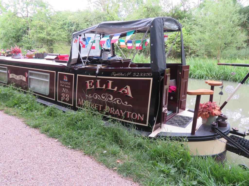Dave and Janets boat nb Ella moored up for the evening. Ella is made up of the first initialis of their daughters and the family surname.