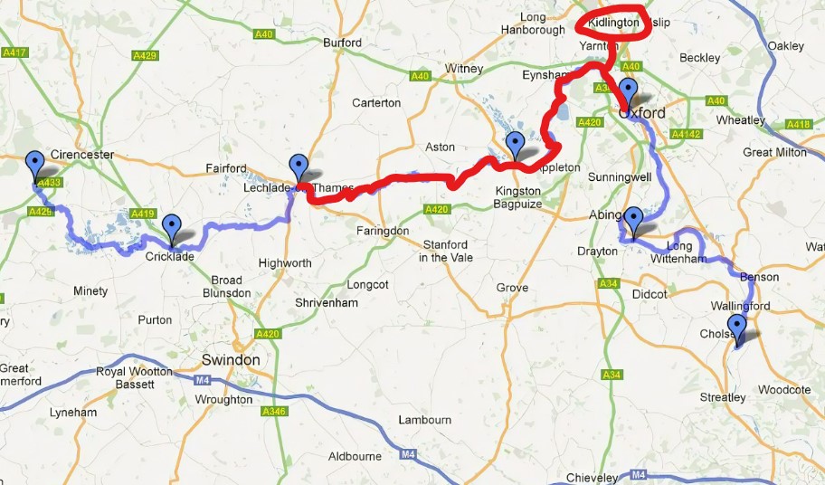 To help orientate you, we have drawn a map of starting in Kidlington and heading south towards Oxford and then turning onto the upper Thames and heading out towards Lechlade. The distance is 27 miles from where we turned off to Lechlade – about 11 hours easy cruising.
