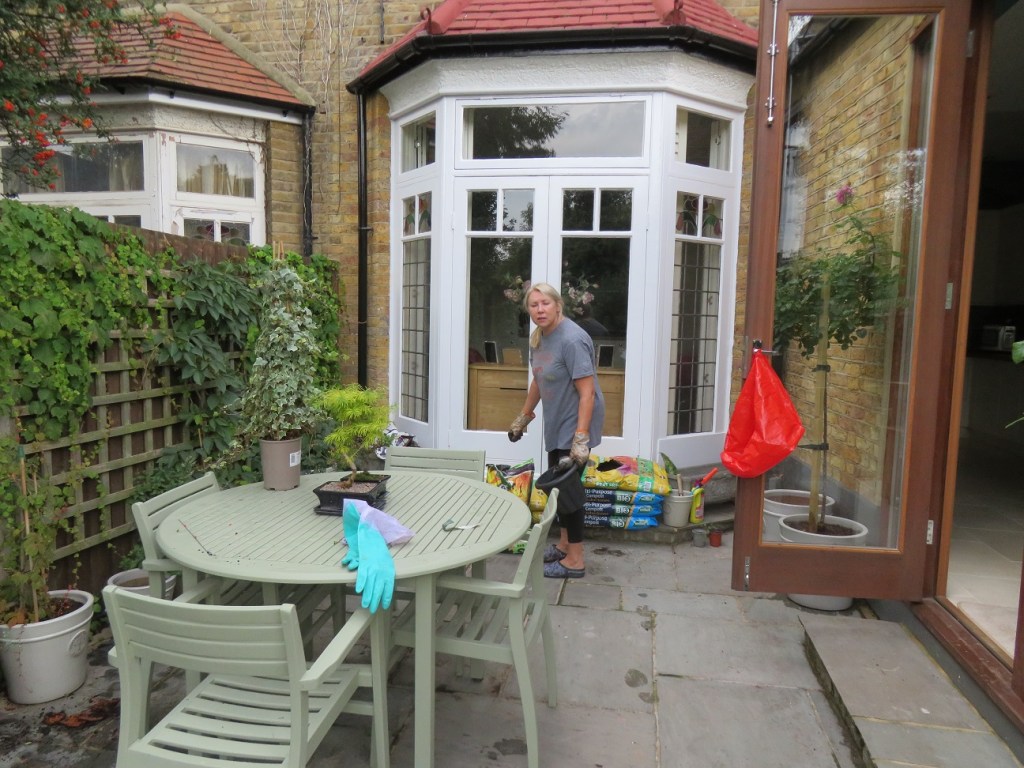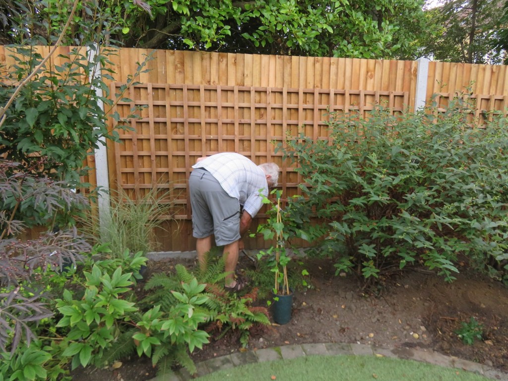 Fras got stuck into helping Karen plant some rose bushes, hydrangeas, clematis and other shrubs whilst Di came around with the watering can, to help them get established. There is still a hose pipe ban on in London and rightly so as there has still be no significant rain.