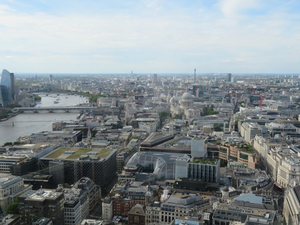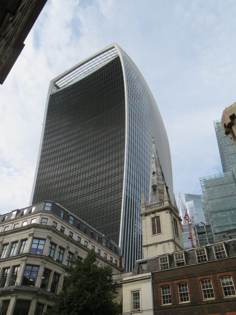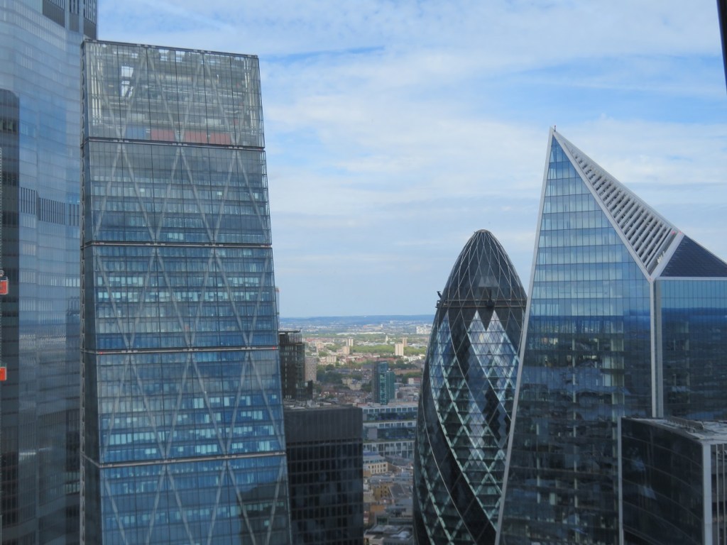 First order of the day was to make our way to the Sky Garden on top of what is affectionately known as the Walkie Talkie. It is located in the City of London – will explain later what this means exactly. After the Walkie Talkie was built, it was discovered that the southerly side of the building acted as a magnifying glass and with the sun searing off its windows it melted parts of an expensive car on the pavement below and people also demonstrated how you could fry an egg on the concrete. The solution was to place louvre type arrangements to break up the impact of the sun.