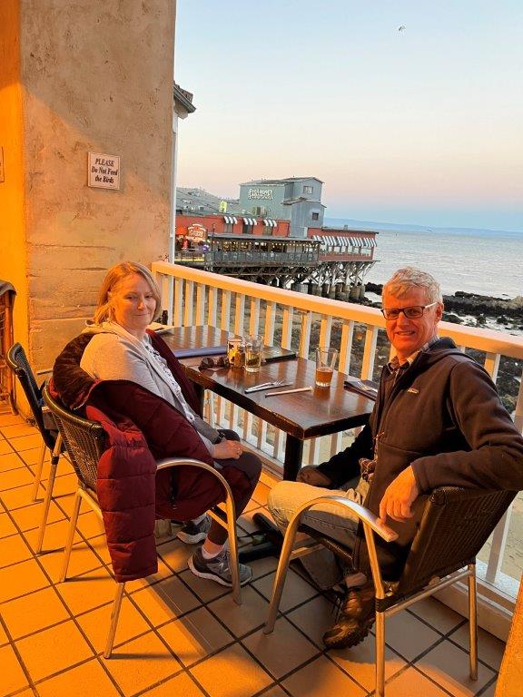Travelling with a dog has its challenges and especially with one that cannot be left alone. Most nights we pick up something from Safeways and heat it in our motel room in a microwave but tonight we found an Italian restaurant that allowed us to sit on the balcony overlooking Monterey Bay with Toque in tow. They also provided an over head heater and……….seals frolicking in the bay right below our balcony. Great end to a fabulous day.