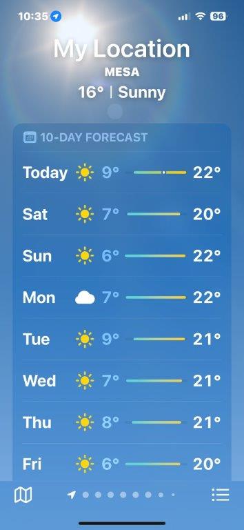 Every day we awake to blue skies and somewhat cool temperatures. It does get down to single digits overnight but by 10.00am it warms up enough that you can dress in shorts and light tops. We have found that by early evening you do need a light fleece on.